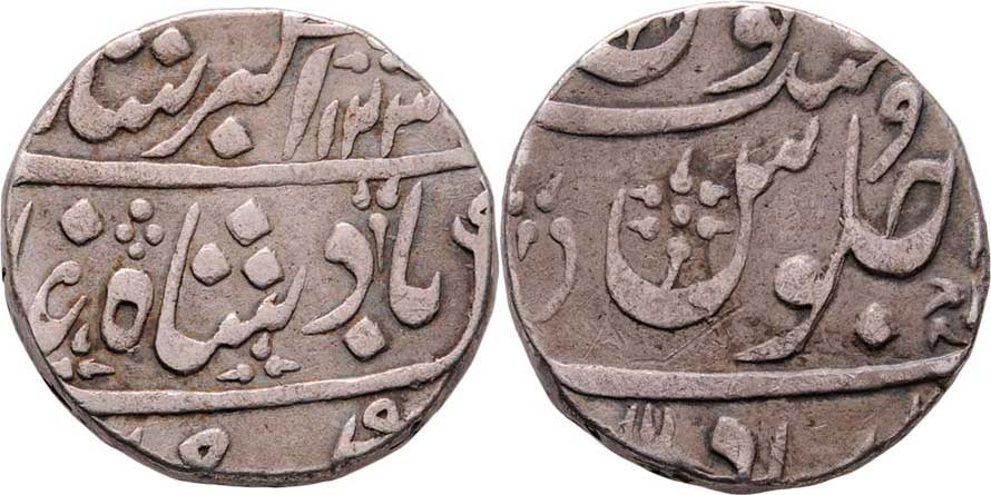 Rupie s titulem Shah Alama II., AH.1232 (= 1816), minc. Ahmadabad, podobná jako KM.28, 11.597, patina