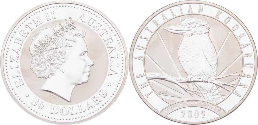 30 Dolar 2009 - kookaburra - inverzní Proof - lesklý relief na matovém pozadí, 100mm, 1000g, KM.1115, kapsle RR!