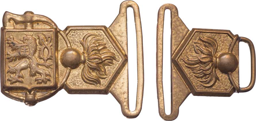 Hasičská spona opasku - zlacená mosaz (1918 - 1938), zapínání opraveno cínem, patina