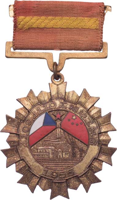 Pamětní medaile za vedení a pomoc při plnění technic. úkolů - panu J.Průškovi udělil v Šanghaji ředitel Jü Kuan, původní etue, průkaz v čínštině, překlad R!