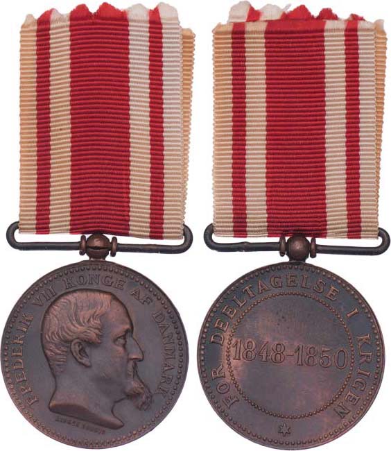 Frederik VII. - Pamětní medaile na válku 1848 - 1850 (založena 1875), BB.141, Sign. Alphee Dubois, bronz 30 mm s původním závěsným ráhnem a stuhou, nep.rysky