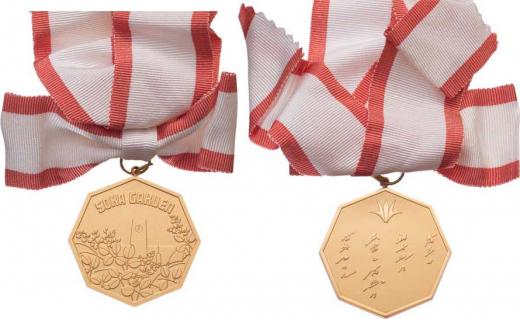 Soka Gakuen - zlacená pamětní osmiúhelníková medaile 50 mm s upín.kruhem a nákrční stuhou, poškoz.etue R!