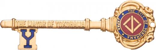 Město Yokohama - pamětní klíč od města s věnováním starosty Ichiho Akusata, zlacený a smaltovaný bronz 60x20 mm, původní etue R!