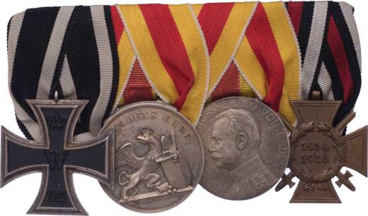 Železný kříž II.třídy, Pamětní kříž 1914-1918, Badenská medaile za statečnost (BB.47f), Badenská medaile za zásluhy (BB.45), krásná spona 4ks R!