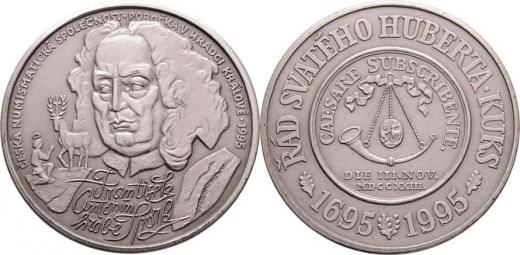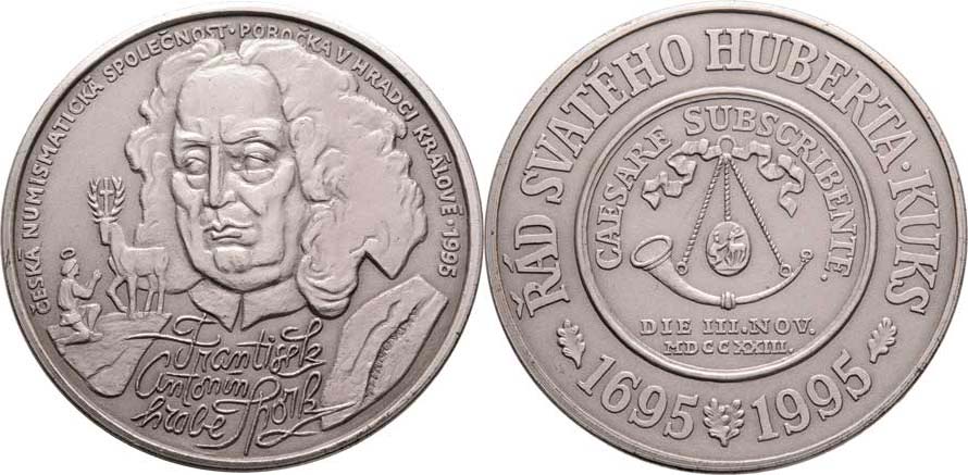 Vitanovský - 300 let Řádu sv. Huberta 1995 - poprsí hraběte Šporka zleva, vidění sv.Huberta, opis/ replika jetonu, opis, Ag900, 42mm, 41.572g, FM.19