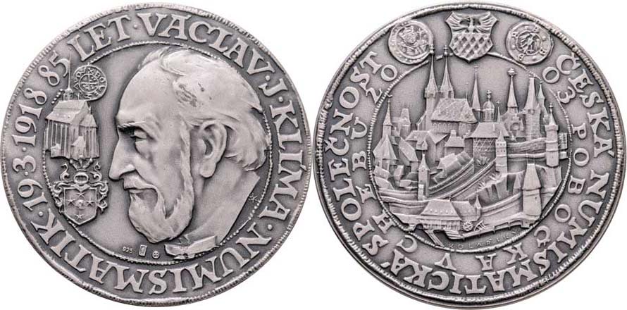 Kolářský - Václav Klíma - 85.narozeniny 1918/2003 - hlava zleva, kostel, znak, mince, opis/ histor. Cheb, opisy, Sign., patin. Ag925, 42mm, 30.730g, 55ks RR!