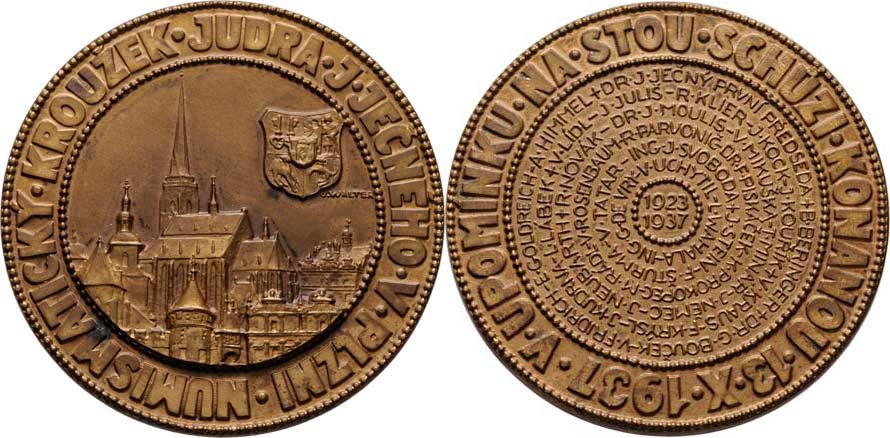 Walter - upomínka na stou schůzi pobočky 1937 - historické budovy, znak, opis / vročení, jména členů, opis, Sign., patinovaný bronz 40 mm, BK.1 (100 ks) R!