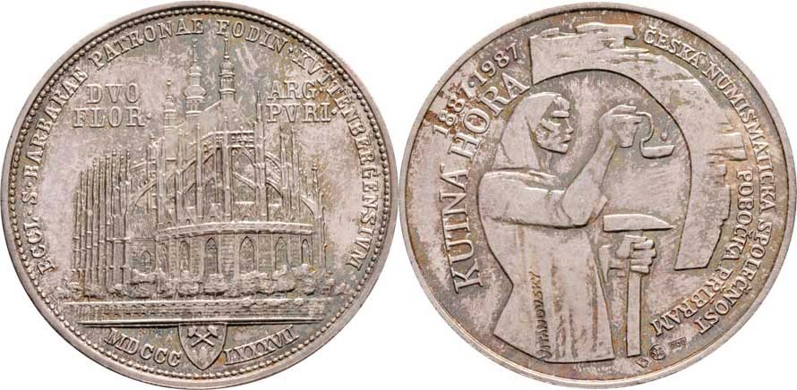 Vitanovský - 100 let kutnohorského dvouzlatníku 1987 - replika reversu mince / havíř s kladivem a kahanem, opisy, Sign., Punc., Ag900, 36mm, 25.598g, FM.7, pat.
