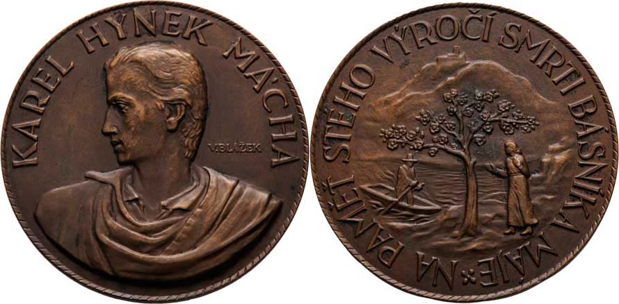 Karel Hynek Mácha - 100.výročí úmrtí 1936 - poprsí zleva, opis / výjev z Máje, opis, Sign., razil Anýž, patinovaný bronz 60mm, 87.718g, PZ.306, téměř