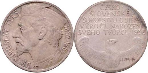 ČOS - 100.výročí narození Dr.Miroslava Tyrše 1932 - portrét v sokolské čapce zleva, opis / sokol, nápis, Sign., Punc., Ag987, 42mm, 30.084g, pěkná patina