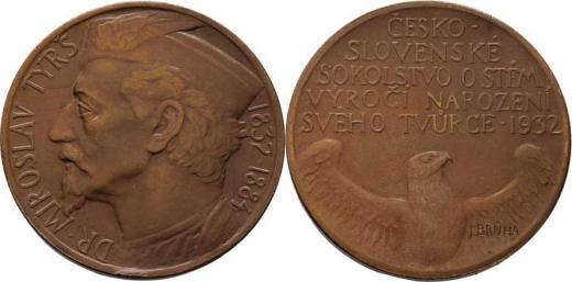 ČOS - 100.výročí narození Dr.Miroslava Tyrše 1932 - Portrét v sokolské čapce zleva, písmo / 5-řádk. nápis a sokol s rozepjatými křídly, Sign., pat.bronz 42 mm