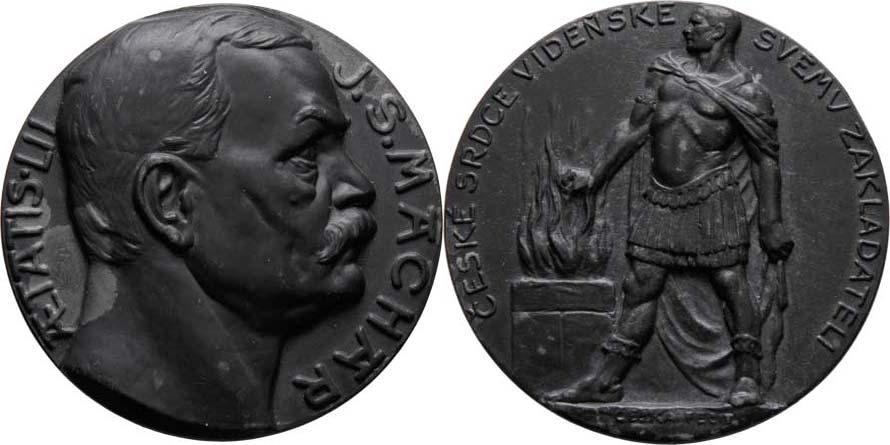 J.S.Machar - České srdce ve Vídni svému zakladateli (1916) - hlava zprava, opis / antický hrdina s rukou v ohni, opis, Sign., zinek 60mm plněný olovem, skvrny