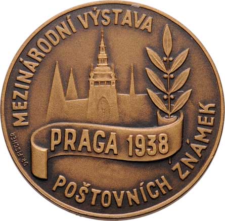 Praga 1938 - Mezinárodní výstava poštovních známek - chrám sv.Víta, vavřínová ratolest, nápisy, Sign., patinovaný bronz 35 mm R!