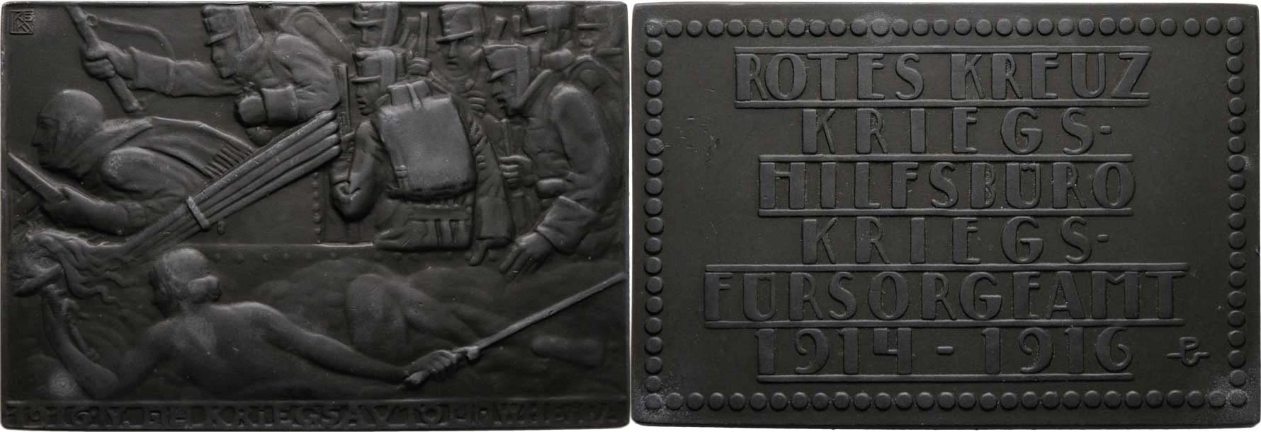Rakouský červený kříž 1914/1916 - vojáci na bojovém automobilu, nápis / 6-řádkový nápis, Sign., patinov. zinek 89x63 mm, dr.úhozy v reversu