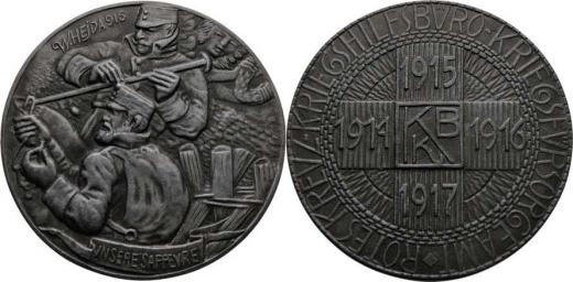 Rakouský červený kříž 1914/1917 - dva ženisté, zátarasy, nápis / kříž, monogram, vročení a opis, Sign., patinovaný zinek 90 mm, téměř