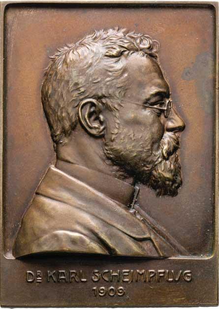 Dr.Karl Scheimpflug 1909 - poprsí zprava, 2-řádkový nápis, Sign., bronz 48x70 mm, krásná patina, téměř