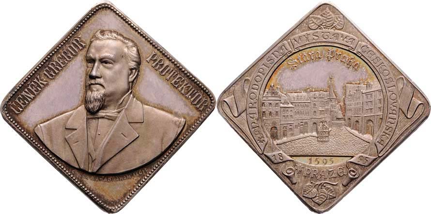 Národopisná výstava Českoslovanská v Praze 1895 - poprsí Čeňka Gregora mírně zleva, opis/ Malé náměstí, opis na stuze, Ag klipa 32x32 mm, 19.806g, pěkná pat.