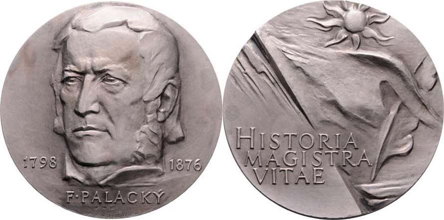 František Palacký - 100 let úmrtí 1976 - hlava mírně zleva, vročení, nápis / slunce, prapor, husí brk, 3-řádk.nápis, Sign., pat. Ag900, 75mm, 198.300g, etue