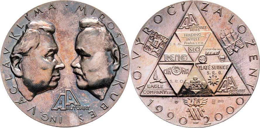Ing.V.Klíma a M.Kubeš - 10 let společnosti Autoart 2000 - dva portréty, emblém, opis/ emblémy, znaky, opis, Sign., Punc., Ag925, 40mm, 35.393g, etue, text