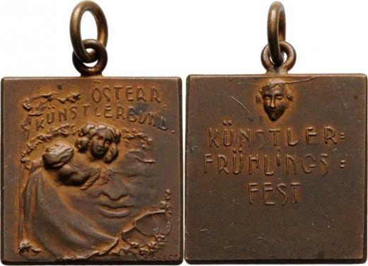 Slavnost Rakouského uměleckého spolku b.l. - dívka, tvář, nápis / tvář čelně, 3-řádk.nápis, Sign., bronzová klipa 17x17 mm s původním závěsem, téměř