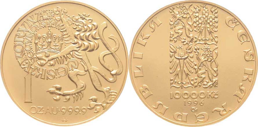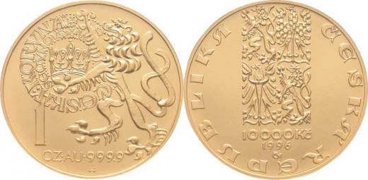 10000 Koruna 1996 - české mince - Pražský groš, KM.21 (Au999, 31.11g, pouze 1.256 ks), kapse, etue