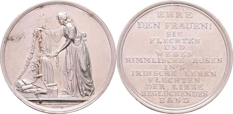 Ctít ženy které splétají nebeské růže (medaile úcty k ženě) b.l. - žena zdobí úl růžemi / 13-řádkový nápis, Sign., Nepunc., Ag 36mm, 13.079g, nep.hr.,rys.
