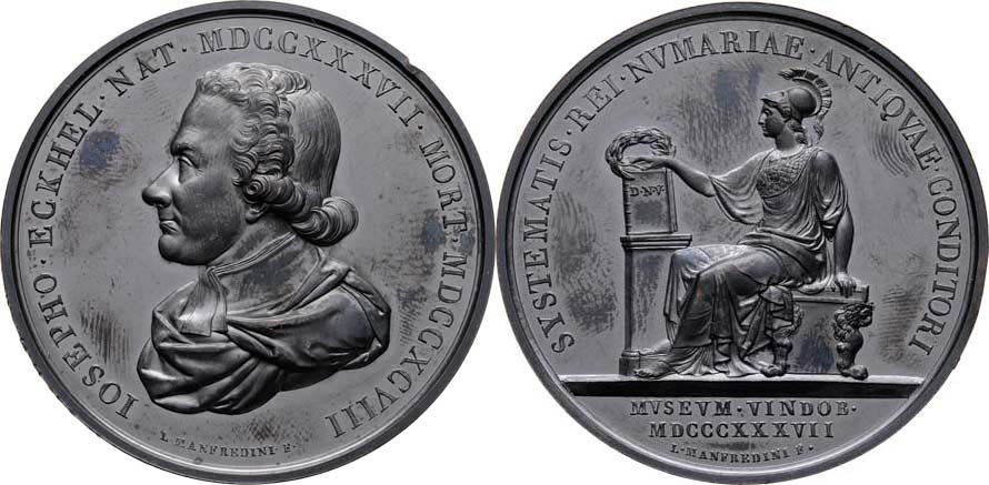 Josef Eckhel - ředitel minc. kabinetu ve Vídni 1837 - poprsí zleva, opis / sedící Aténa, opis a 2-řádkový nápis, Sign., měď 46mm, 39.907g, H.7258(AR), hr.