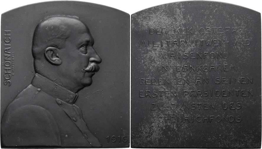 Fr.V.Schönaich, generálplukovník, ministr války 1916 - poprsí zprava, nápisy / osmiřádkový nápis, Sign., lakovaný patinovaný zinek 60x72 mm