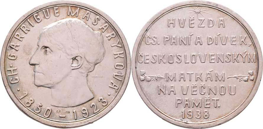 Ch.Garrigue Masaryková - hvězda čs. paní a dívek 1938 - portrét zleva, opis / hvězda, 7-řádk.nápis a lipové snítky, Sign., Punc., Ag987, 35mm, 14.660g, dr.rysky