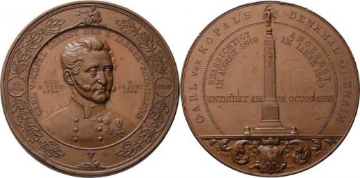 Znojmo - odhalení pomníku plukovníka Kopala 16.X.1853 - poprsí zpředu, dubový věnec, písmo / pomník, znak, písmo, Sign., měď 64 mm, hrany, dr.škr., rys., patina