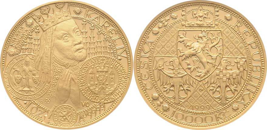 10000 Koruna 1999 - Karel IV.- poprsí a pečeti, KM.41 (Au999, 31.11g, pouze 1.300 ks), kapsle