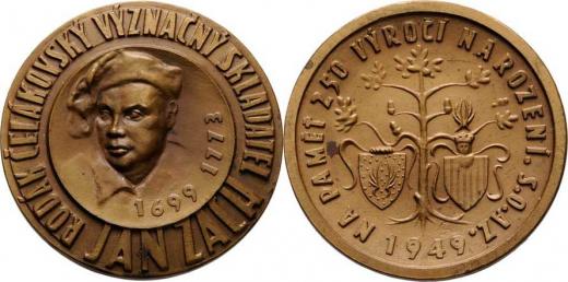 Jan Zach, hudební skladatel (1699 - 1713) 1949 - poprsí mírně zleva, opisy / stromek, dva znaky, opis, Sign., patinovaný bronz 40mm, 32.641g