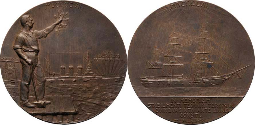 50.výročí založení tech. vysoké školy v Terstu 1907 - přístavní dělník, v pozadí křižník Av.Ferdinand Max. / trojstěžník, nápis, Sign., bronz 60 mm, skvrnka R!