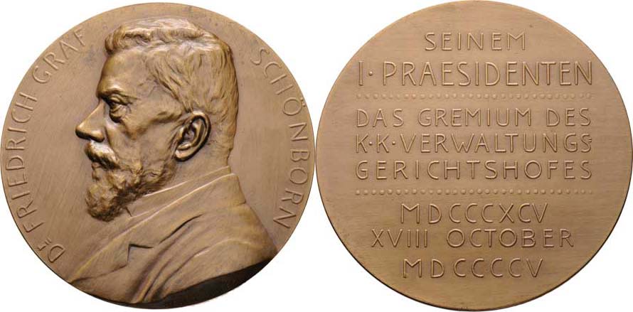 Dr.Friedrich Graf Schönborn - 10.výročí služby 1905 - poprsí zleva, opis / 8-řádkový nápis, Sign., patinovaný bronz 70 mm, téměř