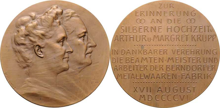 Arthur a Margret Krupp-Berndorf - na stř.svatbu 1906 - dvojportrét zprava / 11-řádkový nápis, Sign., patinovaný bronz 60 mm, Haus.7563