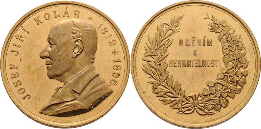 Josef Jiří Kolár - úmrtní medaile 1812/1896 - poprsí zleva, opis / nápis ve věnci, na stuze názvy her, Sign., zlacený bronz 40mm, MZČ.198/6, PZ.311, téměř