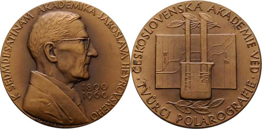 ČSAV - akademik J.Heyrovský - na 70.narozeniny 1960 - poprsí zprava, vročení, opis / polarograf, vavřínové snítky, opis, Sign., patinovaný bronz 60 mm, nep.úhoz