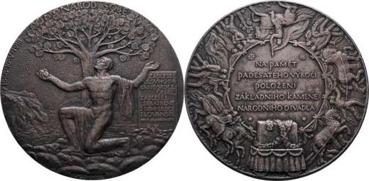 50.výročí položení zákl.kamene Národního divadla 1918 - muž a lípa v krajině, písmo / průvod vezoucí kámen, nápis, Sign., patinovaný postříbřený zinek 75 mm