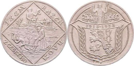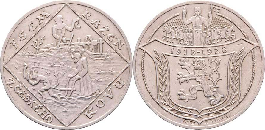 Jsem ražen z českého kovu - 10.výročí republiky 1928 - sv.Prokop orá s čertem, havíř, opis / státní znak, sv.Václav s rytíři, Ag987, 34mm, 20.029g, rysky, tém.
