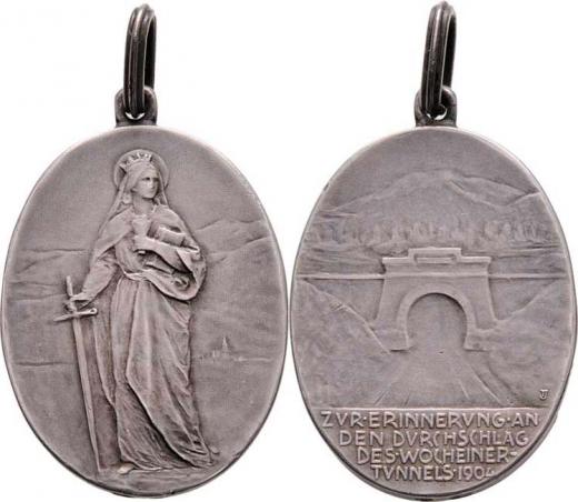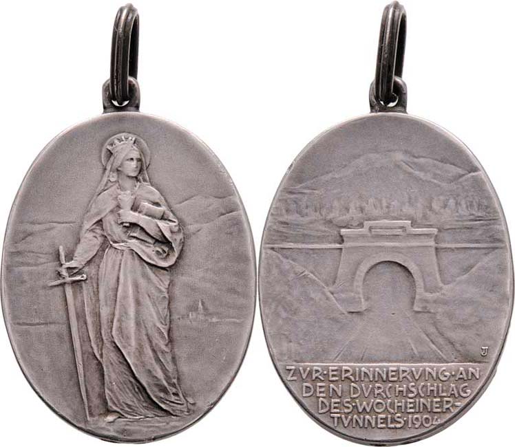 Dokončení tunelu Wocheiner 1904 - svatá Kateřina stojící v krajině / portál tunelu a 4-řádkový nápis, Sign., patinov. Ag 22/28 mm s původ. závěsem, 10.475g
