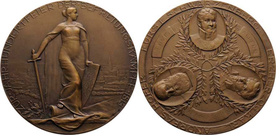 100.výročí bitvy u Lipska 1913 - Austria s mečem a štítem, v pozadí Lipsko, opis / portréty tří hrdinů ve vavřín. věncích, písmo, Sign., patin. bronz 65 mm