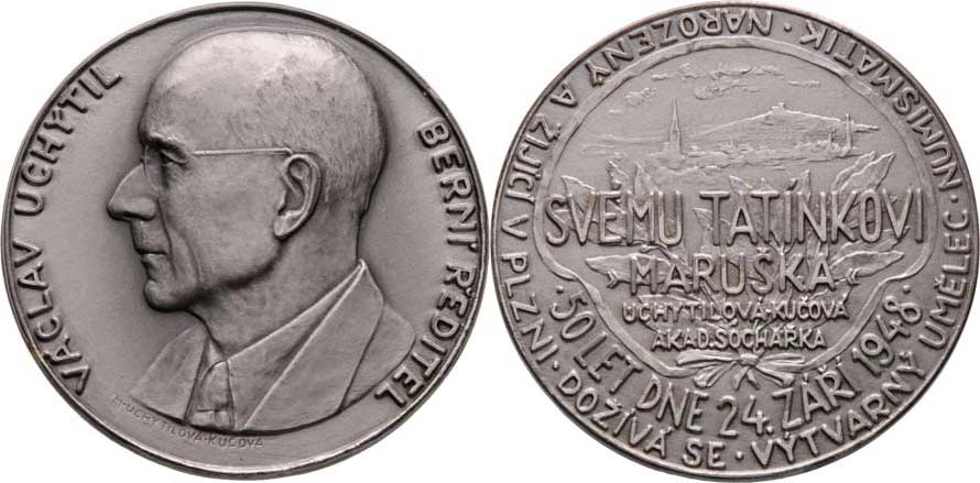 Václav Uchytil - svému tatínkovi Maruška 24.9.1948 - poprsí zleva, opis / pohled na Plzeň, kytice, nápis a opis, Sign., patin. postř. bronz 50 mm, téměř R!