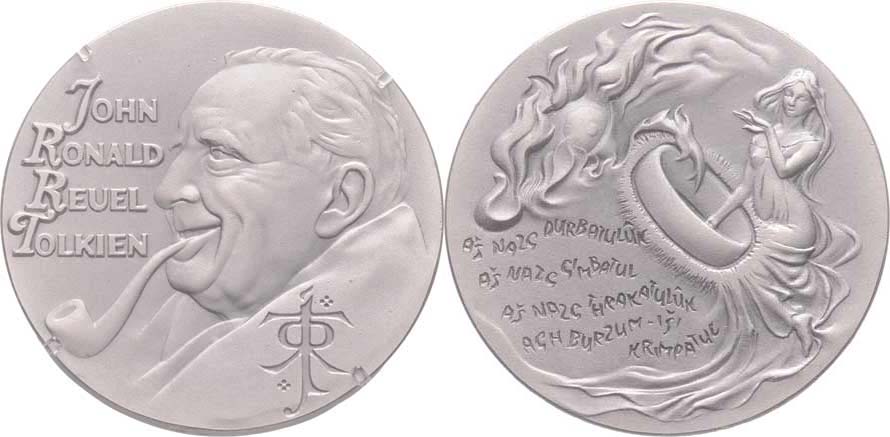 J.R.R.Tolkien b.l. (1999) - poprsí zleva s dýmkou, nápis, monogram / Galadriel, prsten, Sauronovo oko, nápis, Nesign., patin. Ag925, 35mm, 24.575g, 15ks RR!