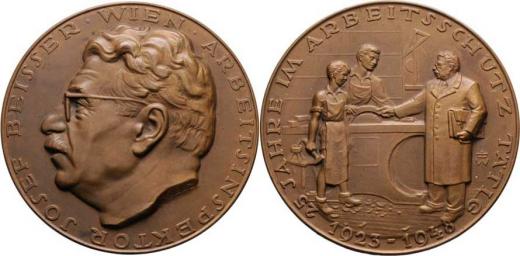 Josef Beisser - pracovní inspektor ve Vídni 1923/1948 - hlava zleva, opis / inspektor v dílně, opis, Sign., patinovaný bronz 60 mm, 105.038g