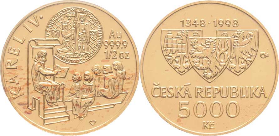 5000 Koruna 1998 - Karel IV. - universita, KM.40 (Au999, 15.55g, pouze 2.000 ks), skvr., kapsle, etue