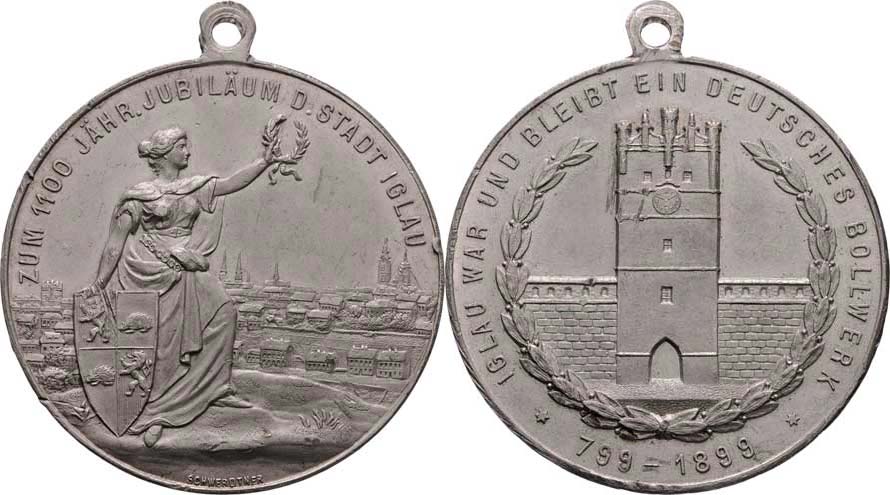 Schwerdtner - cínová medaile na 1100 let města 1899 - žena s měst. znakem, panoráma, něm. opis/ měst. brána ve věnci, něm.opis, 40 mm s původním ouškem, hr.,škr.