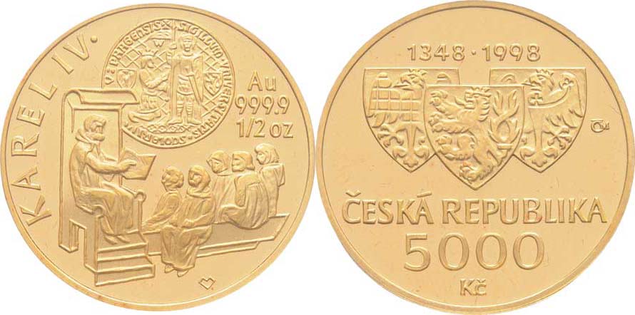 5000 Koruna 1998 - Karel IV. - universita, KM.40 (Au999, 15.55g, pouze 2.000 ks), kapsle, etue