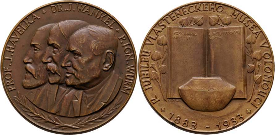 Lenhart, Anýž - 50 let založení Vlast. musea 1933 - tři zakladatelé zleva, opis/ rozevřená kniha, pravěká nádoba, věnec a opis, Sign., bronz 50 mm, Taul.523