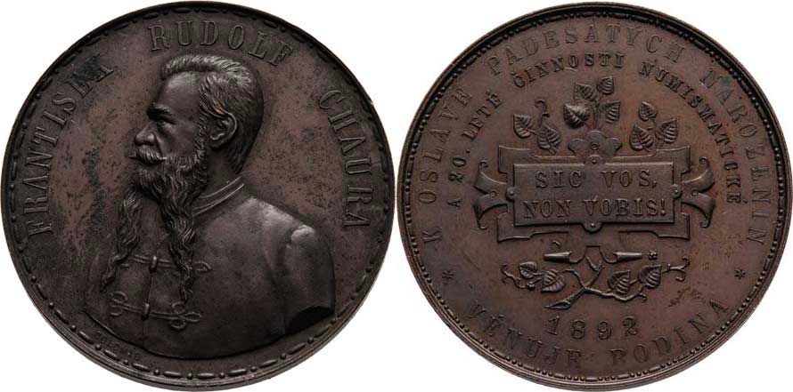 Frant. Rudolf Chaura - medaile na 50.narozeniny 1892 - poprsí zleva, opis/ tabulka s latin. heslem, lipov. ratolest, dvojitý opis, Sign.Golčmid, měď 34 mm, pat.