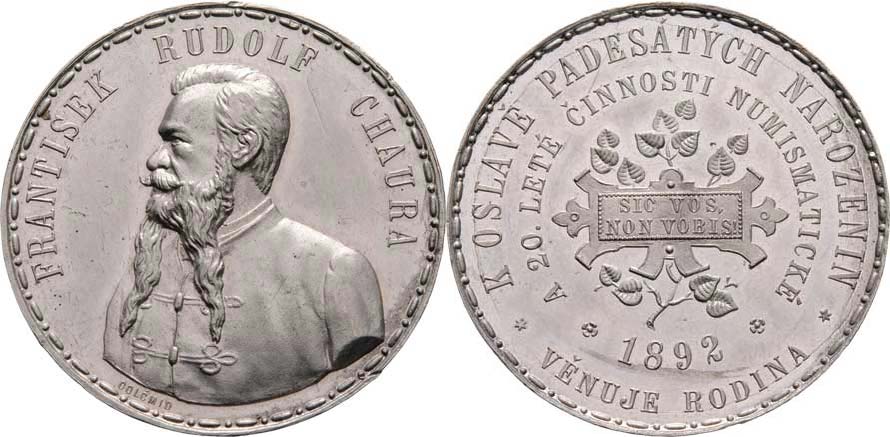 Frant. Rudolf Chaura - medaile na 50.narozeniny 1892 - poprsí zleva, opis/ tabulka s latin. heslem, lipov. ratolest, dvojitý opis, Sign.Golčmid, cín 34 mm, pat.